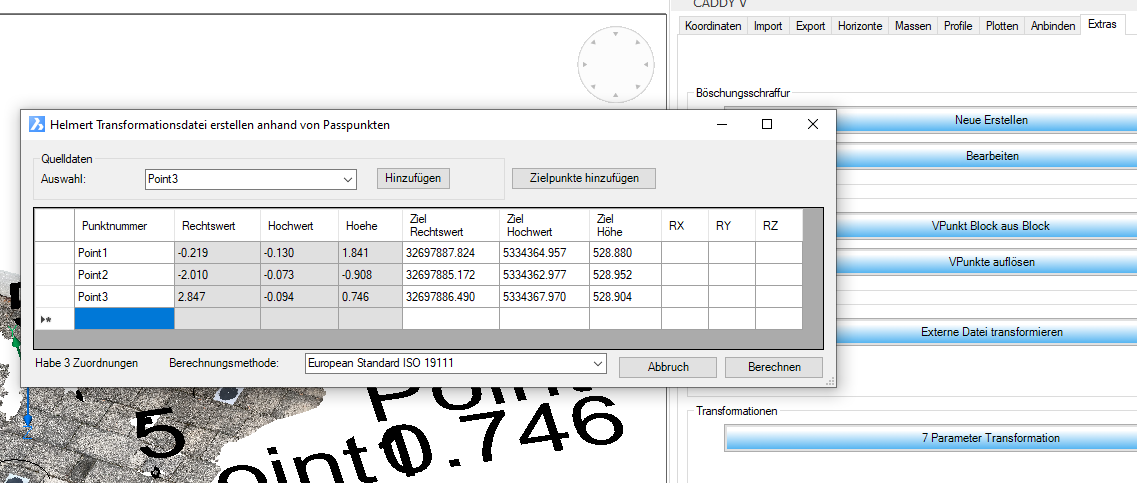 Die CADdy-V-Transformationsbibliothek bietet auch eine 7-Parameter-Helmert-Transformation, die nach unseren Vorbereitungen nun mit wenigen Klicks aus der lokalen Punktwolke Weltkoordinaten erzeugt.