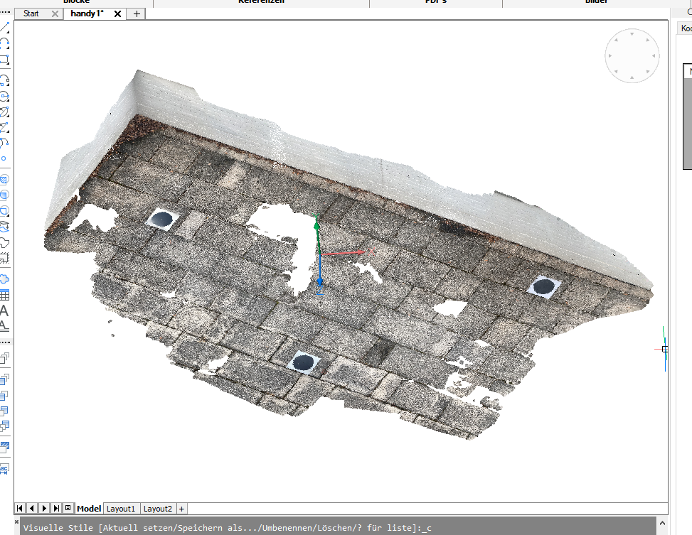 Die BricsCAD-V21 bordeigene Funktion “Einfügen -> Punktwolke anhängen“ wird genutzt, um die Daten beispielsweise im LAS-Format zu visualisieren. Hierbei wird die Punktwolke mit ihren Originalkoordinaten in eine DWG-Zeichnung eingebettet. Das sieht dann so aus: