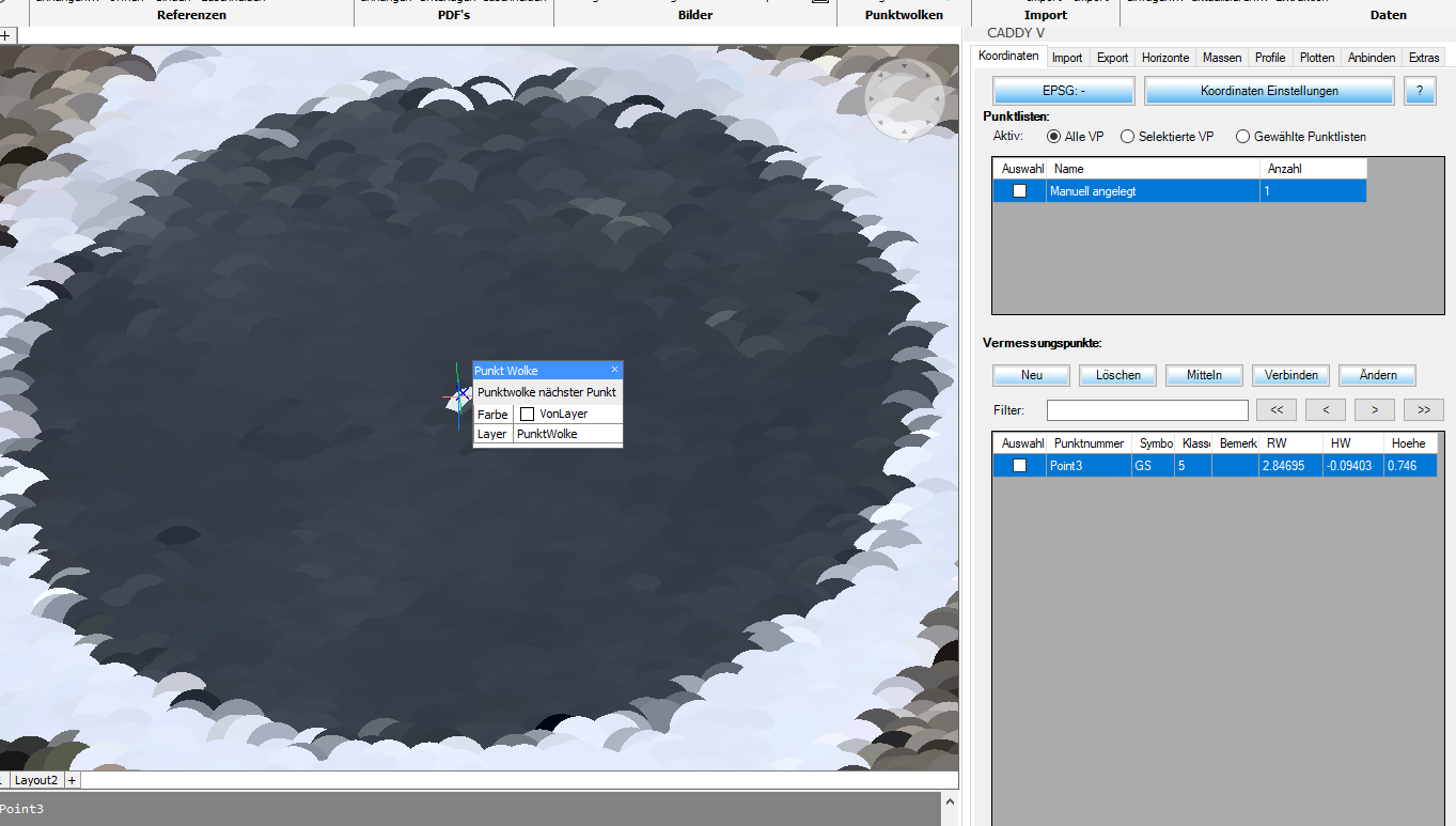 Im Beispiel sieht man gut 3 Passpunkte, die mit GPS schnell zentimetergenau aufgenommen werden können. Um sich die zu den Passpunkten passenden lokalen Koordinaten zu ermitteln, können die Punkte in der DWG digitalisiert werden, hierzu bietet BricsCAD einen komfortablen 3D-Fang an einzelnen Punktwolken-Punkten. Gespeichert werden die 3D-Vermessungspunkte dann direkt in der CADdy-Koordinatenverwaltung.