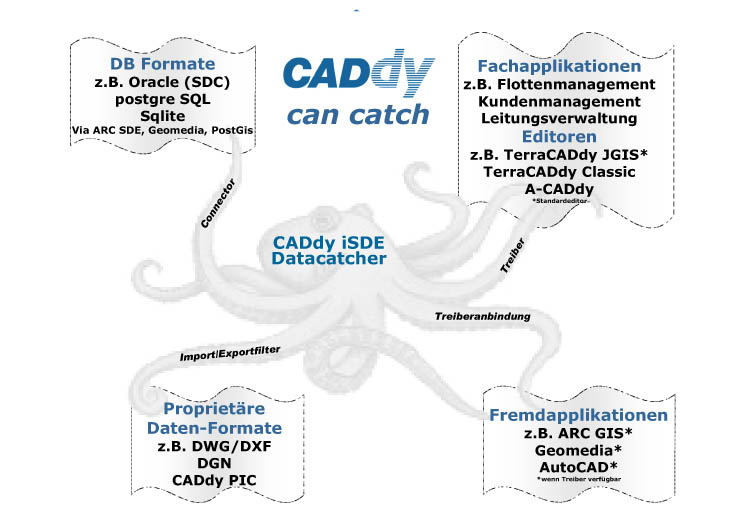 Daten in proprietären Formaten (DWG, DXF, DGN, CADdyPIC etc.) können ebenfalls direkt (on the fly) in den Datenspeicher geladen und mittels eines Zeitstempels der Refresh-Zeitpunkt eingestellt werden.