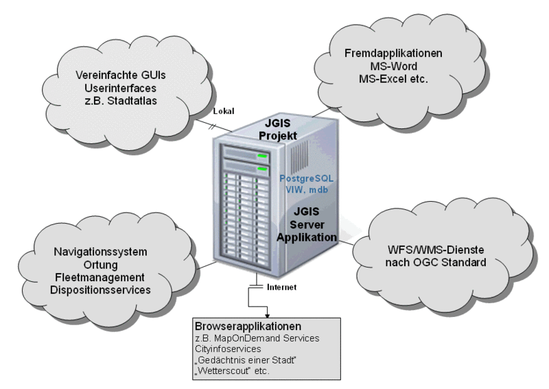 Die Serverversion erlaubt die Ansteuerung der meisten Funktionen von TerraCADdy JGIS von externen Programmen direkt über http Request oder auch über XML requests. Dabei spielt es keine Rolle, ob das Programm auf dem gleichen Arbeitsplatz (Single User-Version) in einem Firmennetz (Intranet-Version) oder im Internet läuft. Die wichtigsten Funktionen können von Außen, also von Fremdprogrammen angesteuert und abgefragt werden. Die Kommunikation eines Clients, z.B. Explorer, Büroprogramme, Word oder Zeichenprogramme, erfolgt über XML und sogenannte Austauschverzeichnisse bzw. Streamingmodelle.
