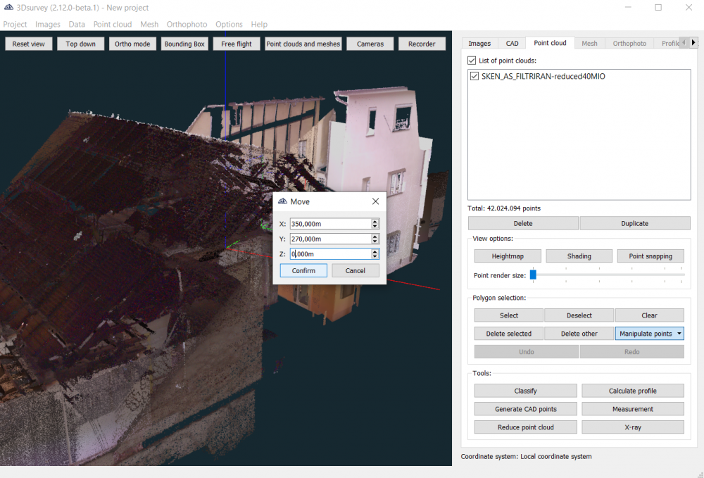 Mit der Version 3Dsurvey 2.12 haben Sie jetzt die Möglichkeit, die gesamte Punktewolke oder das Mesh für einen bestimmten Vektor (Wert) zu verschieben, wobei Sie einfach den Verschiebungswert in das Dialogfeld eingeben.