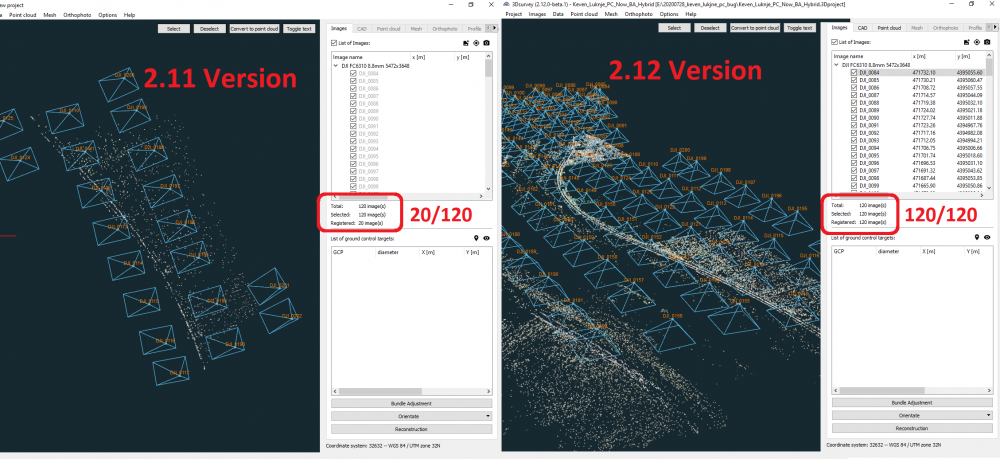 Hohe Vegetation, geringe Bildüberlappung aufgrund von Geländeunterschieden, unscharfe Bilder führen in der Regel dazu, dass nicht alle Bilder im BA-Schritt erfolgreich angepasst werden. Die neue robustere Bündelausgleichung erzielt 30 bis 50% mehr angepasste Bilder im Vergleich zur vorherigen Version!