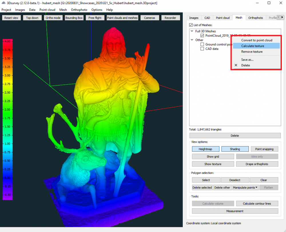 Klicken Sie mit der rechten Maustaste und speichern oder löschen Sie den ausgewählte PointCloud oder das ausgewählte Mesh, berechnen Sie schnell die Textur für das bereits erzeugte Mesh oder wählen Sie eine beliebige andere verfügbare Option. Arbeiten Sie intelligenter und schneller als je zuvor!