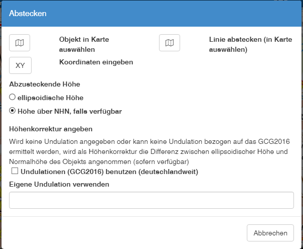 Neben dem Serverumzug wurde auch die Absteckfunktion in WebCADdy erweitert. Sie können nun beim Abstecken wählen, ob Sie von einem Objekt die ellipsoidische Höhe, die Normalhöhe oder eine komplett individuell eingegebene Höhe abstecken möchten. Probieren Sie es gleich mal aus!